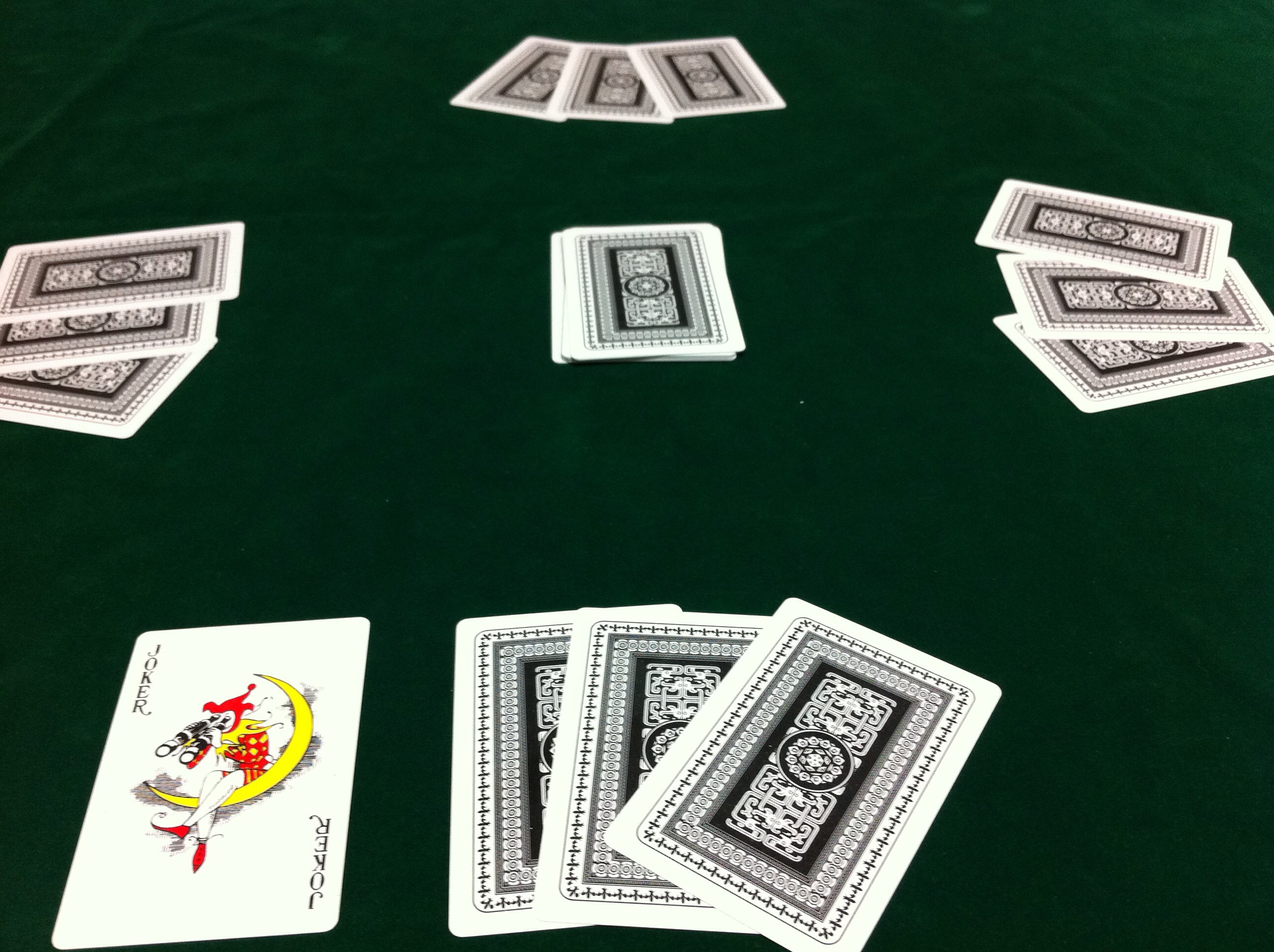 2)年長者、あるいは、じゃんけんをして勝ったプレイヤーがジョーカーを取り、自分の目の前に置きます。以後、このジョーカーを