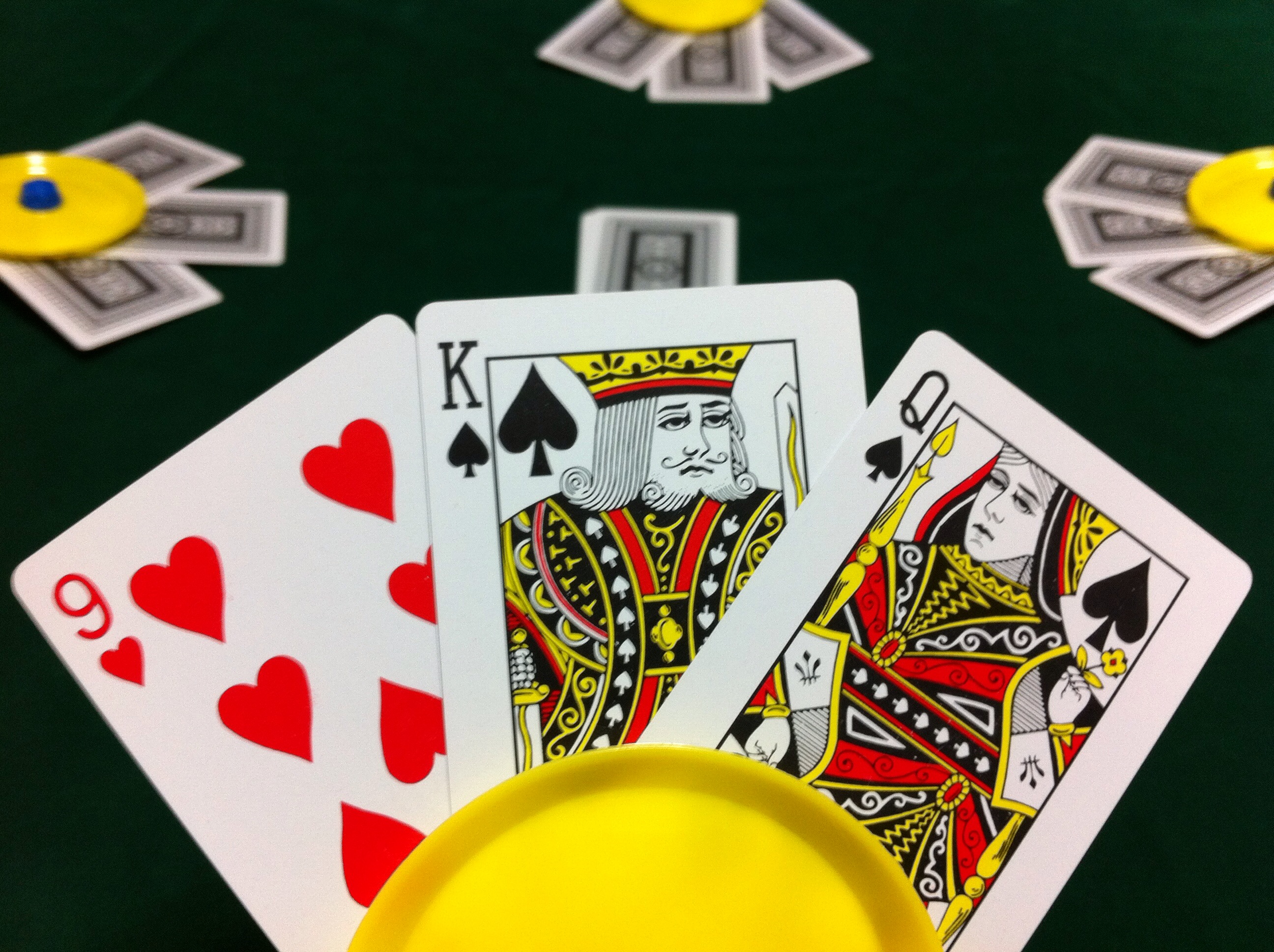 4)各プレイヤーは、配られた3枚のカードを取り、自分だけが中身を見えるようにして手に持ちます。以後、これを