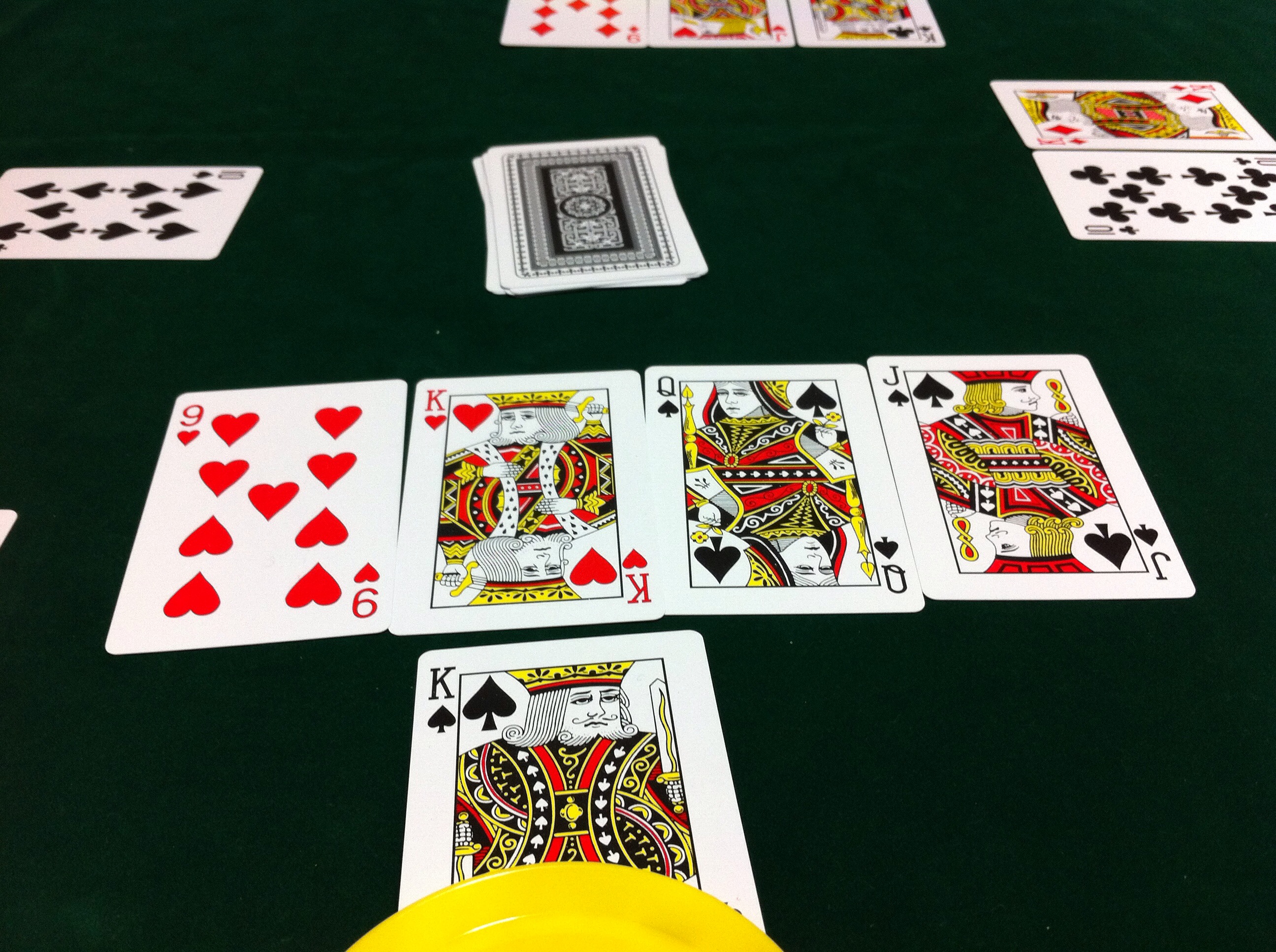 【準備】・トランプ一式 ×1・本ルール・紙とペン(得点の記録用)0)机を囲むように座ります。目の前にカードを出すことを考えると、隣のプレイヤーとは少し距離を開けて座った方が良いでしょう。